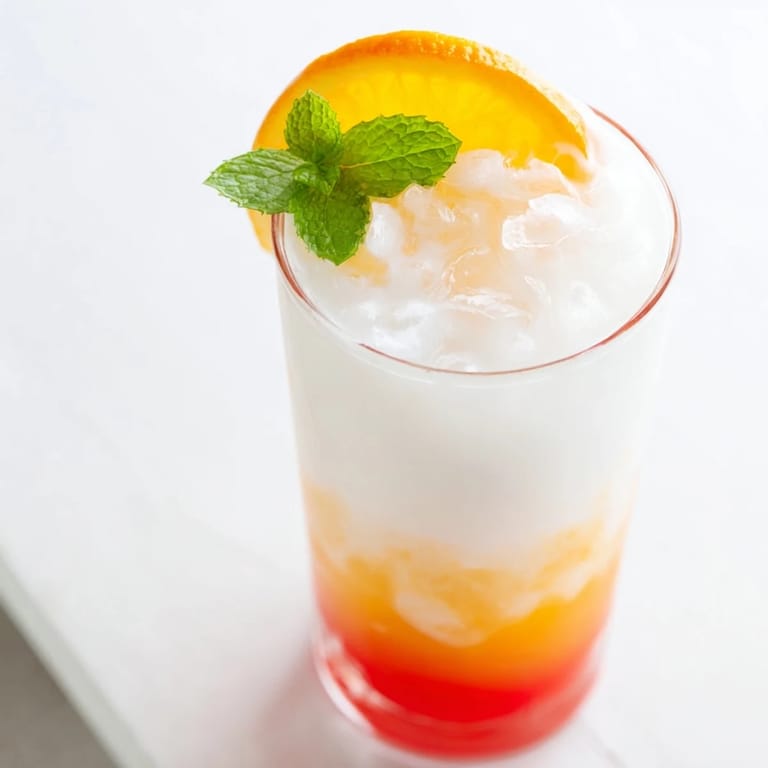Das schönste an diesem Getränk ist, dass die Chemie der Dichten das Ganze für dich macht. Kokosmilch ist dichter, daher sinkt sie; Orangensaft ist leichter und schwimmt oben; Granatapfelsirup findet seinen Weg durch beide hindurch. Ich bin sicher, es gibt eine wissenschaftliche Erklärung, aber es fühlt sich eher wie Magie an, wenn man es zum ersten Mal sieht.
