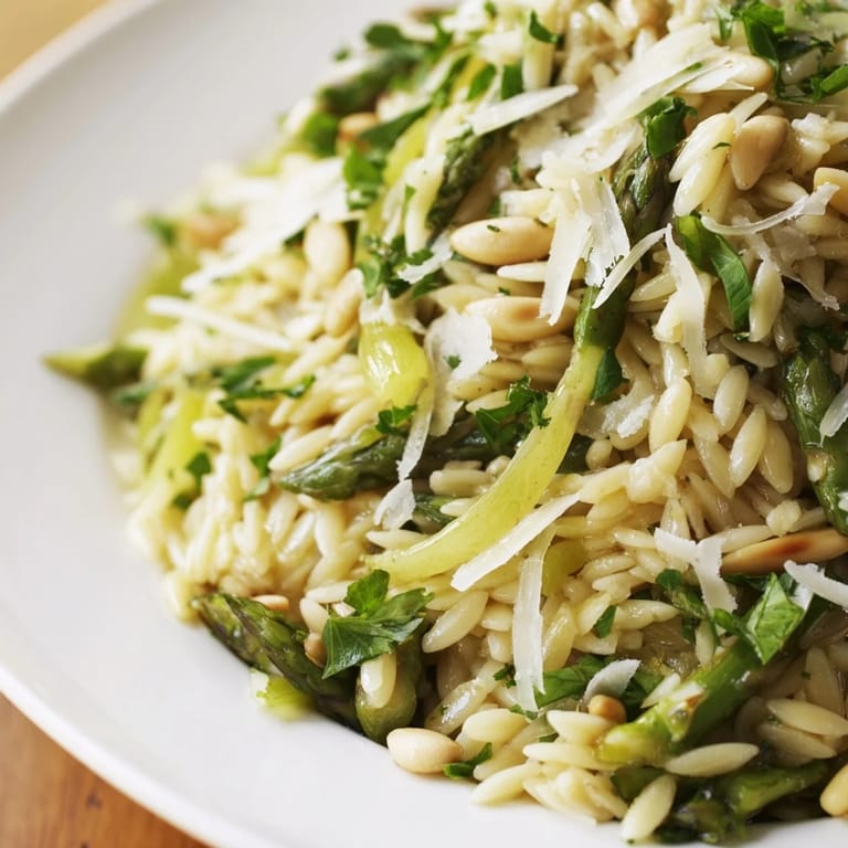 Merken A fresh, vibrant salad combining tender orzo, crisp shaved asparagus, and Parmesan, all tossed in a zesty lemon–olive oil dressing. Perfect for spring and summer gatherings, this Mediterranean-inspired dish brings together seasonal flavors in a simple yet elegant way.
