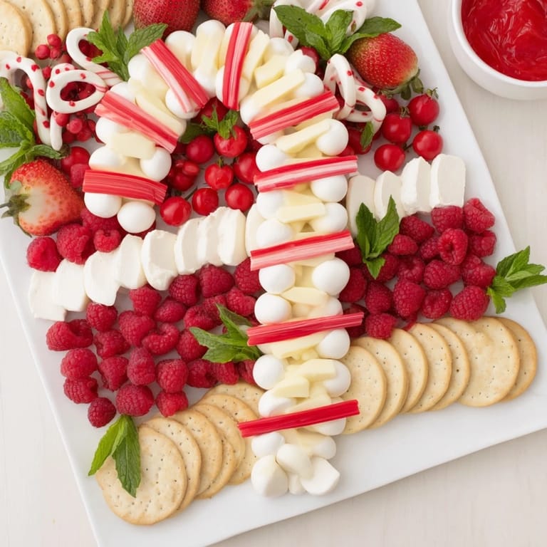 Merken Ein lebhaftes, auffälliges Snack-Brett mit süßen und herzhaften Häppchen in festlichen Rot- und Weißtönen, perfekt für Feiertagsversammlungen.