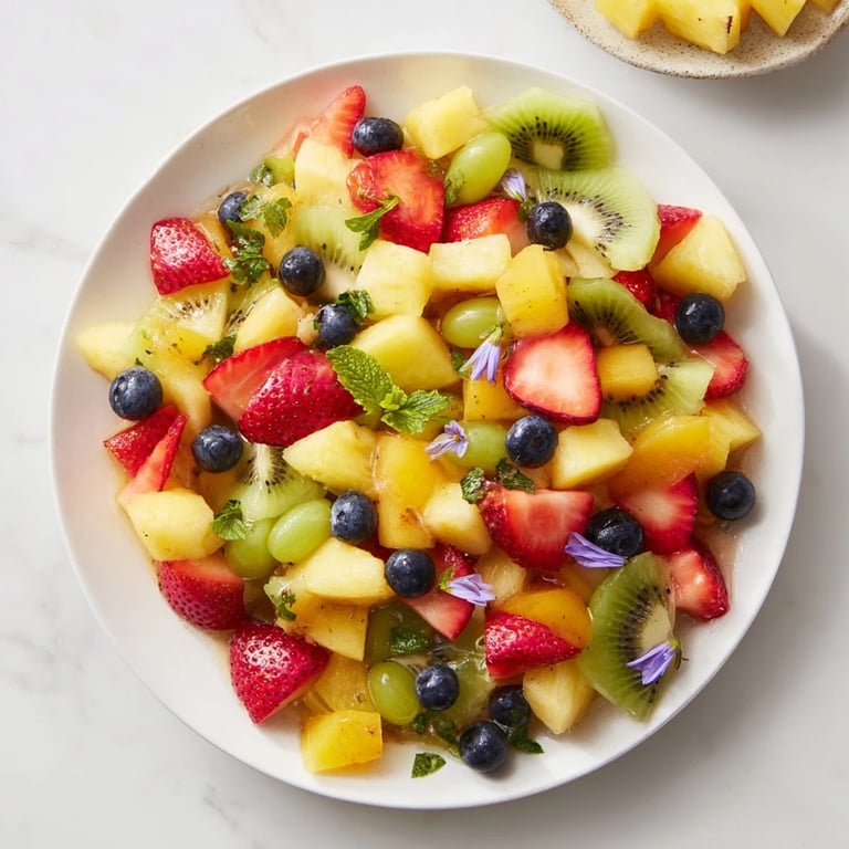 Merken Ein lebhafter und erfrischender Obstsalat mit einer bunten Auswahl an saisonalen Früchten, leicht gesüßt und wunderschön präsentiert–perfekt für jeden festlichen Anlass.
