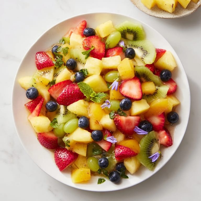 Diese bunte Mischung vereint frische Erdbeeren, Ananas, Kiwi, Blaubeeren, Weintrauben und Mango zu einem lebendigen Genuss. Das Limetten-Honig-Dressing sorgt für eine angenehme Süße und Frische. Vor dem Servieren mit frischer Minze und essbaren Blüten garniert, wird das Gericht zum Hingucker. Optimal gekühlt entfalten sich die Aromen besonders gut. Variationen mit Orange oder Granatapfel sind möglich. Ideal als erfrischende Beilage bei sommerlichen Festen.
