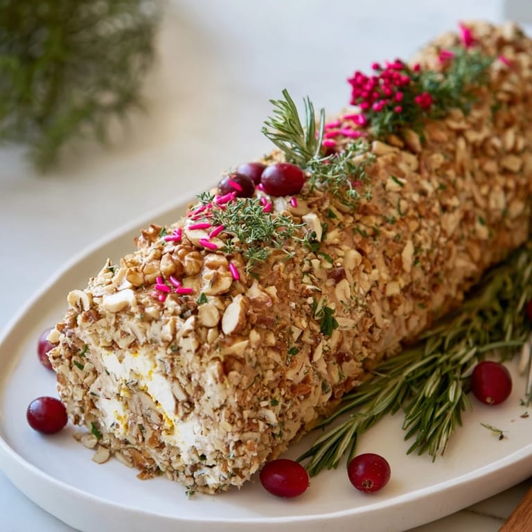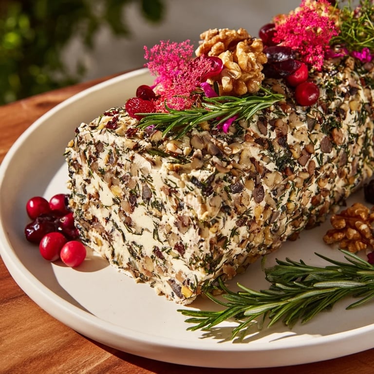 Merken Ein festlicher, herzhafter Käserolle, geformt und dekoriert wie ein Weihnachtsstollen, perfekt als elegantes Zentrum für Ihren Festtagstisch. Cremige, würzige Käse kombiniert mit Kräutern und Nüssen sind mit einer reichhaltigen, strukturierten Hülle umgeben und dann mit essbaren Blättern verziert für eine atemberaubende Präsentation.