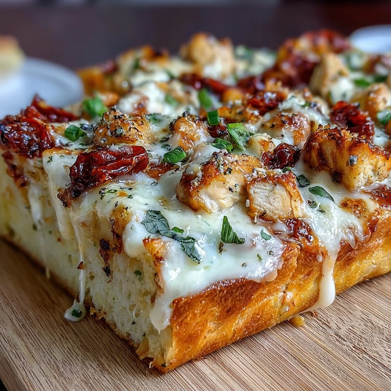 Cremiges Hähnchen mit getrockneten Tomaten, Parmesan und Mozzarella auf knusprigem Pizzaboden – unwiderstehlich gut.