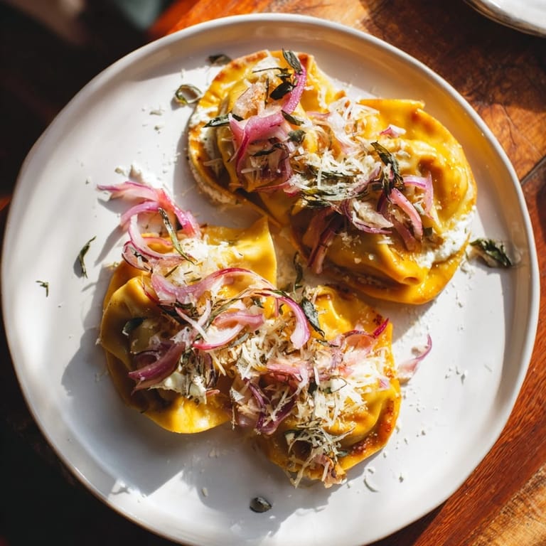 Merken Ein köstliches Fusionsgericht, das traditionelle schwäbische Maultaschenaromen mit der Knusprigkeit von Fladenbrot kombiniert, belegt mit karamellisierten Zwiebeln, frischen Kräutern und einer cremigen Käsemischung.