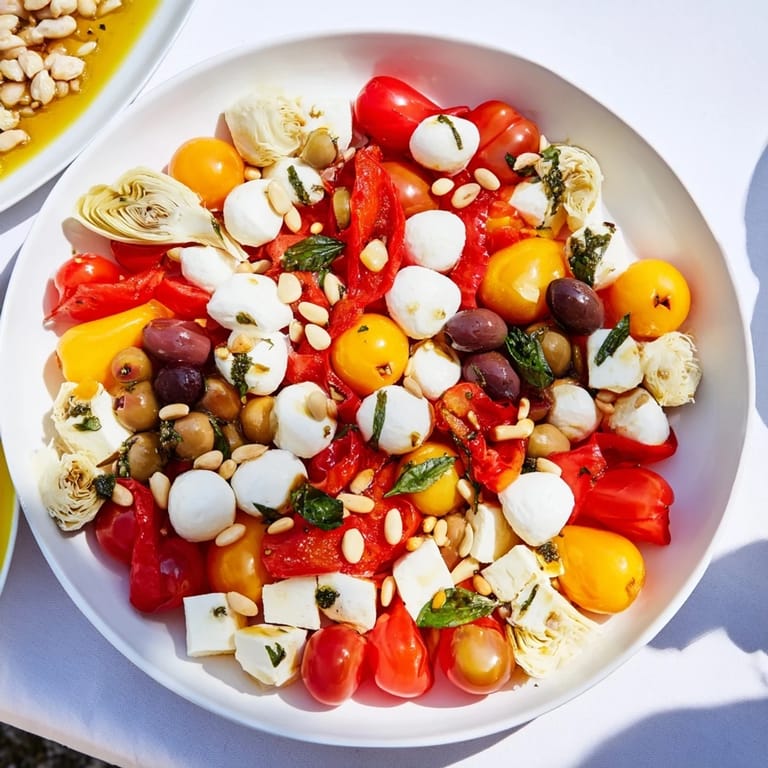 - Beilagen: 1/2 Tasse marinierte Artischockenherzen, geviertelt; 1/2 Tasse geröstete rote Paprika, in Scheiben; 1/2 Tasse geröstete Pinienkerne (optional); knusprige Brotscheiben oder glutenfreie Cracker zum Servieren