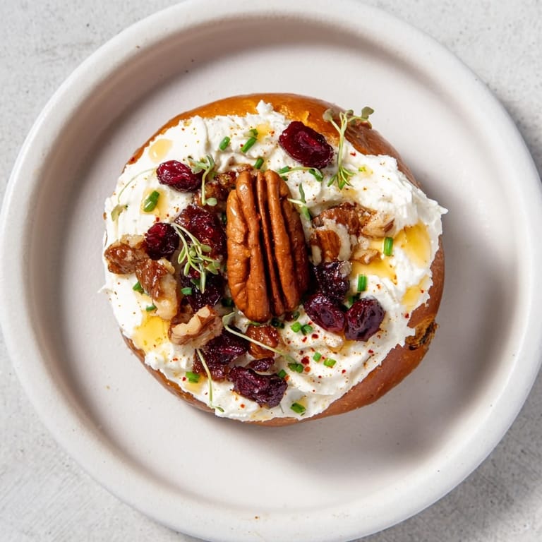 - Topping: 24 geröstete Pekannusshälften, 2 EL getrocknete Cranberries, fein gehackt, 1 kleine Jalapeño, fein gewürfelt (Kerne entfernt für weniger Schärfe), 1 EL frischer Schnittlauch, fein gehackt, 1/4 TL geräuchertes Paprikapulver, Meersalzflocken nach Geschmack