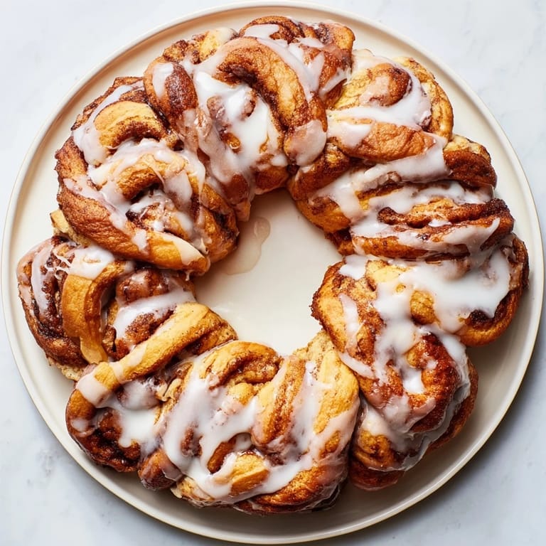 Merken Ein beeindruckender, teilbarer Zimtschnecken-Kranz – weich, fluffig und mit Vanilleguss beträufelt. Perfekt für einen festlichen Brunch oder einen gemütlichen Morgen.