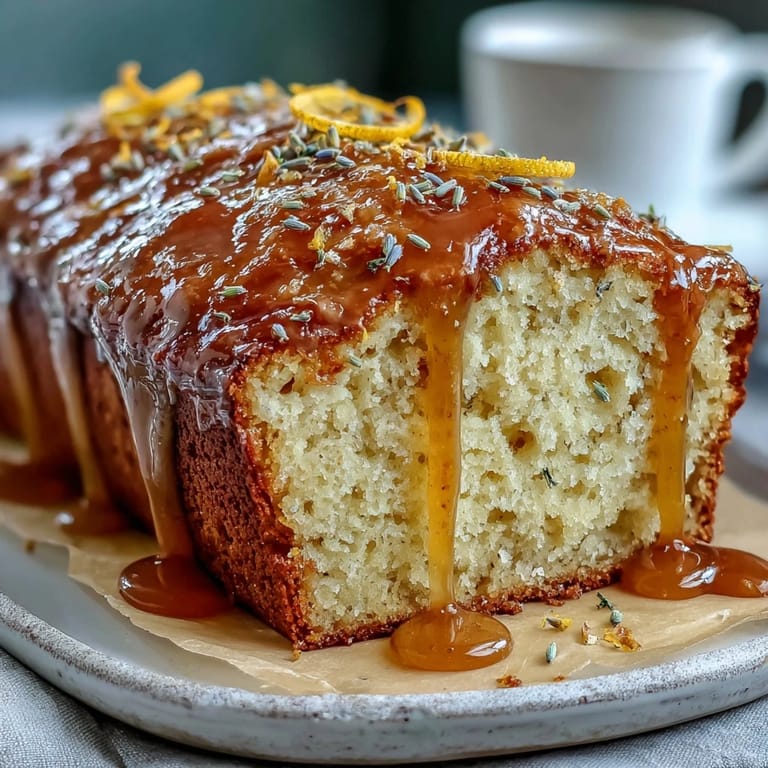 Duftendes Zitronen-Lavendel-Brotkuchen mit Honigglasur – ein zarter Kuchen mit Lavendelaroma und zitroniger Note, gekrönt von einer glänzenden Honigglasur. Merken